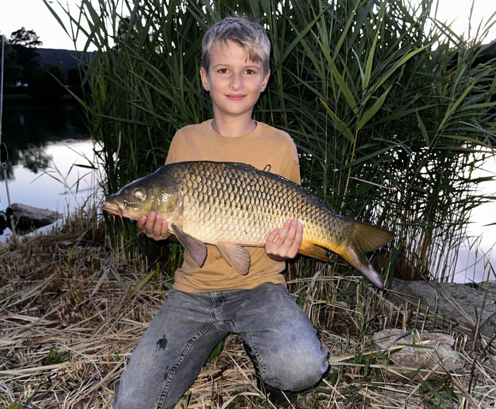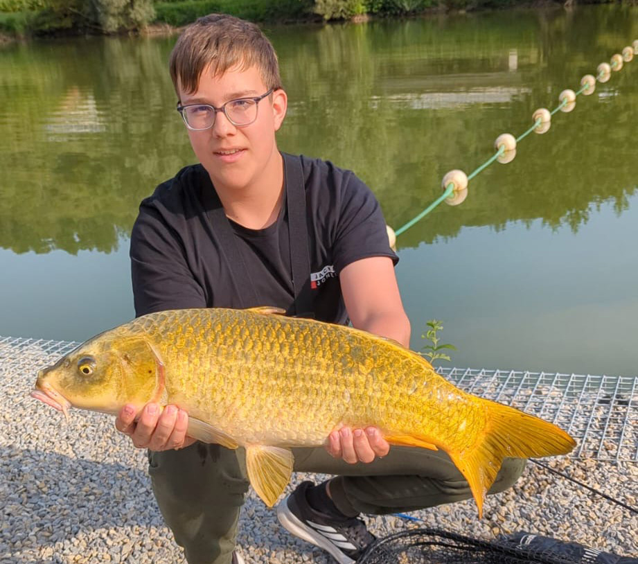 Max mit goldigem Karpfen aus unserem Vereinsgewässer.